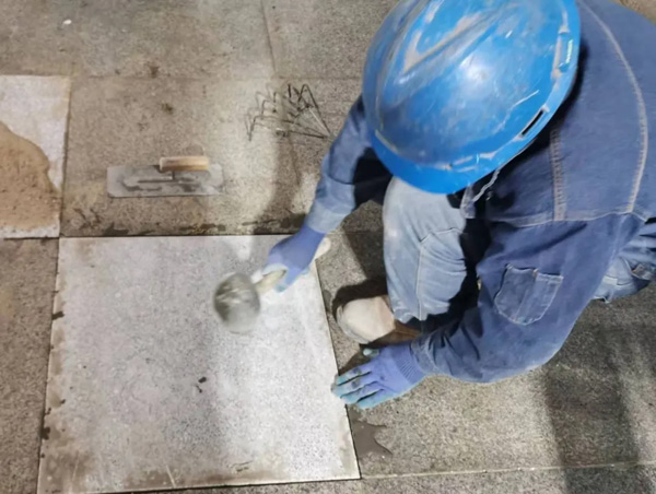 与此同时,综合检修队在汽机厂房零米,对于破损地面砖和设备基础墙面砖大力开展更换工作,在更换前,从东到西对于地面砖全部进行检查,发现破损砖,立即标记,保证无遗漏,在更换期间,瓦灰能手合理分配时间,一人拿着电镐松土,另一人在大理石放置处,耐心“配料”,然后轻轻搬起大理石,精准放在指定位置,确保顺直且整齐,铺好大理石后,再用橡胶锤,在大理石上小心敲几下……他们动作熟练,有条不素,虽然机器运行声音很大,但是他们依然“安心”施工,保障汽机厂房整体文明形象,目前,破损砖更换工作正在有序推进。